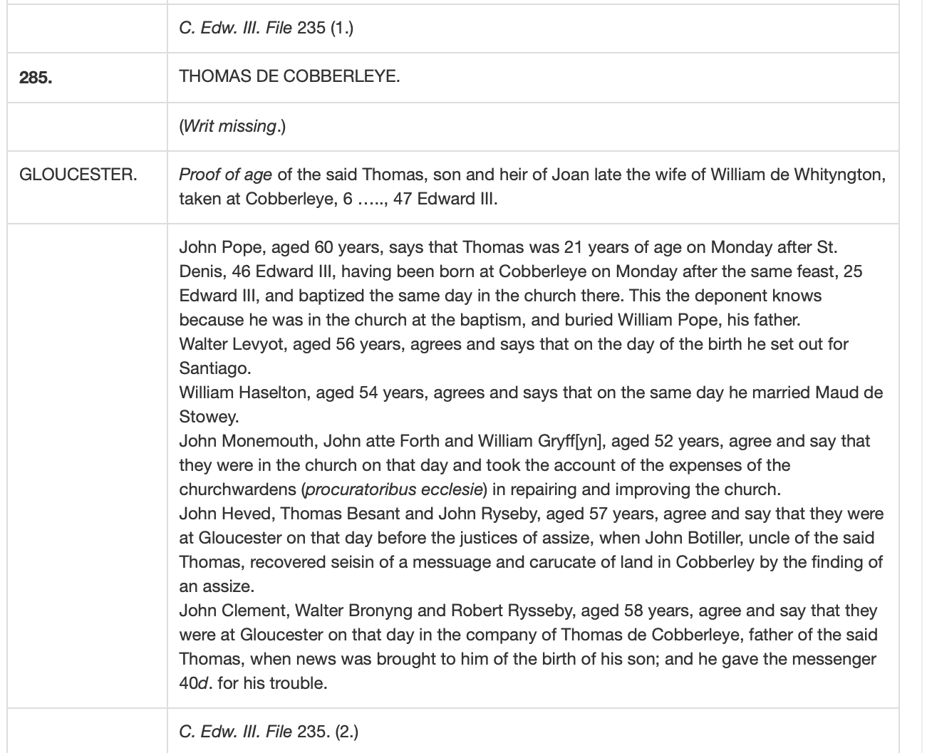 "Proof taken at Cobberiore, out ... an Edward I1 C1313-41, before the abovesaid escheator. [John Pope, aged 6o, says the said Thomas was 21 on Monday next after the Feast of St. Dennis, 46 Edward III [1372], and was born at Cobberleye and baptized in the church of that town, and this he remembers, because he was in the said church when the said Thomas was baptized, burying William Pope, his father. Walter Levyot, aged 56, remembers the date of the baptism, because on that day he set out for St. lago [sanctum Jacobum]. William Haselton, aged 54, remembers the date, because he married his wife, Maud de Stowe, on the same day. John Monemouth, aged 52, was making an account with the proctors of the said church on the day of the said baptism, with regard to the repairs thereof. John Heved . . ., Thomas Gesanl, and John Ryseley remember the date, because on that day they appeared before the King's Justices of Assize at Gloucester, when John Botiller, uncle of the said Thomas, recovered seisin of a message and carucate of land in Cobberleye by virtue of an assize. Inquisitiones Post Mortem. 75 John Clement, Walter Bronyng, and Robert Russell were at Gloucester in the train of Thomas de Cobberleye, father of the aforesaid Thomas, when news was brought of the birth of his said son. Chan. Inq. p.m., Ser. I, 47 Edward III, ist Nos., No. 55. New reference, Chan. Ing. p.m., Edward III, File 235